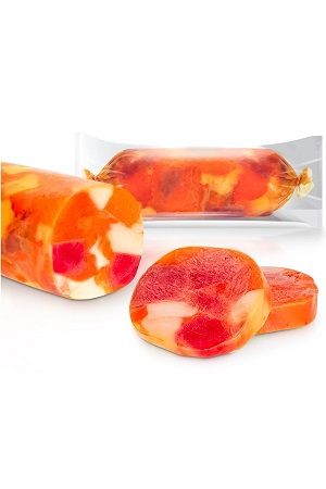 Холодного копчения рыбный рулет из кусочков рыбы, состав: Рыбный рулет, приготовленный из кусочков рыбы (лосось (Salmo salar), масляная рыба (Lepidocybium flavobrunneum), тунец (Thunnus albacares), соль, дым из ольхи).