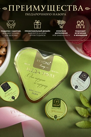 Darilni set medenega suflje Od Srca do srca, sestavine: tri različne okuse medenega sufleja. Vsak kozarec je narejen na osnovi naravnega cvetličnega medu, stepenega s posebno tehniko do kremaste konsistence, z dodatkom jagodičevja, oreščkov ali sadja. Izdelek ne vsebuje umetnih barvil, konzervansov ali GSO. Sestavine: 1.Pinjoli. Naravni cvetlični med, jedrca pinjol. Klasični okus s celimi oreščki. 2. Melica z limono. Naravni cvetlični med, meta ali melisa, sok in cedar limona. 3.Pistacija. Naravni cvetlični med, zdrobljene pistacije, izvleček klorele (za naraven zelen odtenek). Hranilna vrednost na 100g: Beljakovine: 1,0g, Maščobe: 2,5g, Ogljikovi hidrati: 78,0g, Energijska vrednost: 338 kcal/1415 kJ.