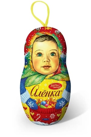 Novoletne darilo Aljonka Matrješka, 300g, sestavine: Sladkor, koruzni sirup, nehidrogenirana rastlinska maščoba za slaščičarske izdelke (palmovo olje in njegove frakcije, emulgatorja: E 492, E 322; antioksidanta: E 304, E 306, E 320, E 321), nehidrogeniran nadomestek kakavovega masla lavrinskega tipa (hidrogenirano palmovo olje, emulgatorja: E 492, E 322), pšenična moka višjega in prvega razreda, suha sirotka, kakav v prahu, rafinirano dezodorirano palmovo olje, emulgatorja: E471, E 476, mlečni lecitin; sol, arome, želirna sredstva: karagenan, pektin; regulatorji kislosti: citronska kislina, mlečna kislina, natrijev citrat, natrijev bikarbonat; Humektant sorbitol, stabilizator encim invertaza, barvili: antocianini (E 163, E 1400, konzervansa E 202, E 330), E 171, izvleček vijoličnega sladkega krompirja, klorofil (barvili: E 141, E 100; emulgator E 433); koruzni škrob, pecilni prašek amonijev karbonat, rafinirano sončnično olje, polizdelek iz tartufov (sladkor, kakavova masa, kakavovo maslo, aroma), suha smetana, jogurt v prahu, posneto mleko v prahu, encimski pripravek “Protopad”, liofiliziran jagodni prah, naravna aroma izvlečka vanilije. Energijska vrednost – 2030,0 kJ/480,0 kcal, Maščobe – 23,0 g, od tega nasičene maščobe – 12,5 g, Ogljikovi hidrati – 63,0 g, od tega sladkorji – 54,5 g, Beljakovine – 5,0 g, Sol – 0,02 g