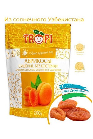 Pošušene naravne marelice Tropi, sestavine: Razkoščičene suhe marelice, žveplov dioksid. Hranilna vrednost na 100 g izdelka: Energijska vrednost 1166 kJ/275 kcal, Maščobe 0,7 g, od tega nasičene maščobe 0,3 g, Ogljikovi hidrati 62 g, od tega sladkorji 54 g, Beljakovine 2,7 g, sol 0,03 g.